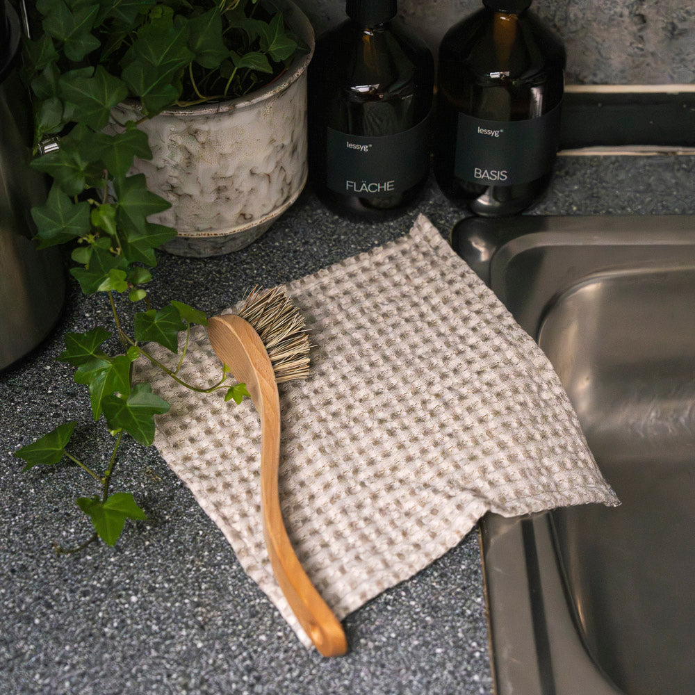 Leinen zählt zu den ressourcenschonendsten Naturfasern: europäischer Flachs wächst mit minimalem Wasserbedarf, ohne künstliche Bewässerung, und ist biologisch abbaubar. Durch die Wiederverwendbarkeit ersetzt dieses Multituch unzählige Einwegprodukte wie Papierservietten oder Einwegschwämme.