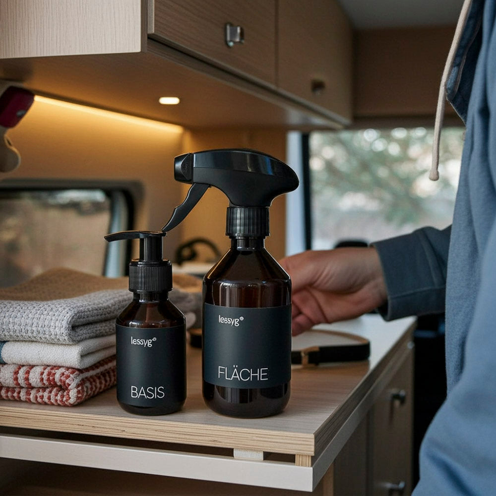Das lessyg® Camping-Reiniger Set kombiniert ein hochkonzentriertes Universalreiniger-Konzentrat und eine praktische Mischflasche – ideal für nachhaltiges Reinigen unterwegs, beim Camping, Vanlife oder auf Reisen. Es folgt unserem Anspruch: 100 % natürliche Inhaltsstoffe, keine aggressive Chemie, vegan und biologisch abbaubar.