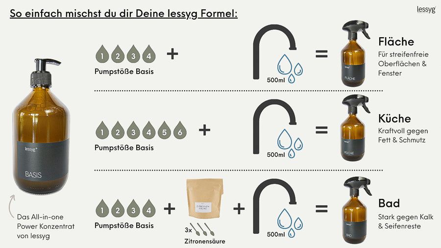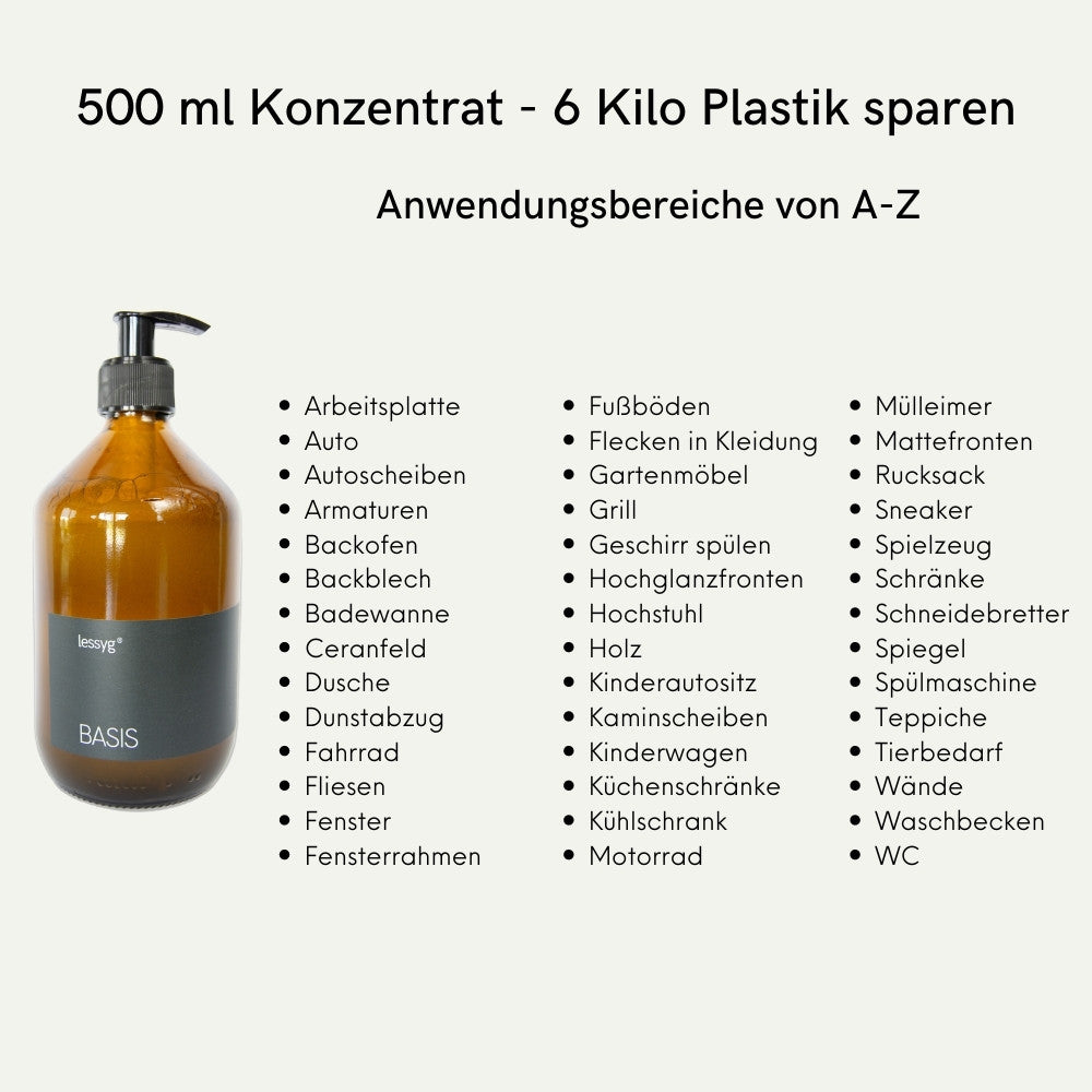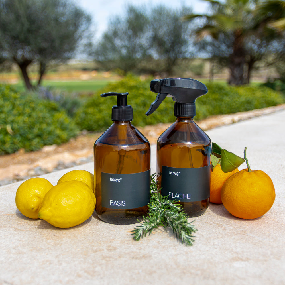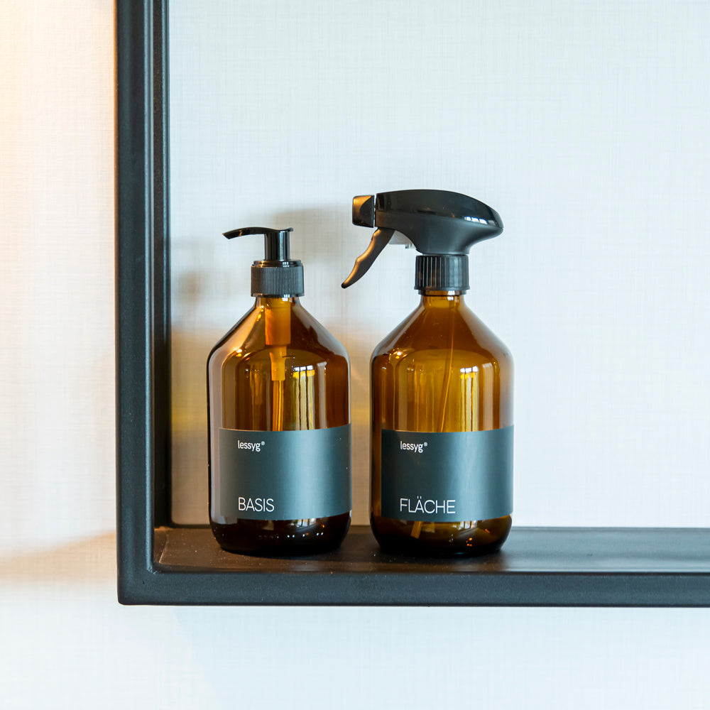 Dein komplettes Starter-Set: ✓ lessyg® Basis All-in-One Reinigungskonzentrat (500 ml) mit praktischem Pumpkopf ✓ Hochwertige Glasflasche (500 ml) aus recyceltem Braunglas – etikettiert für deinen Wunschraum: Fläche, Bad oder Küche ✓ Dein Wunschduft: Orange, Eukalyptus-Rosmarin oder neutral (duftfrei)
